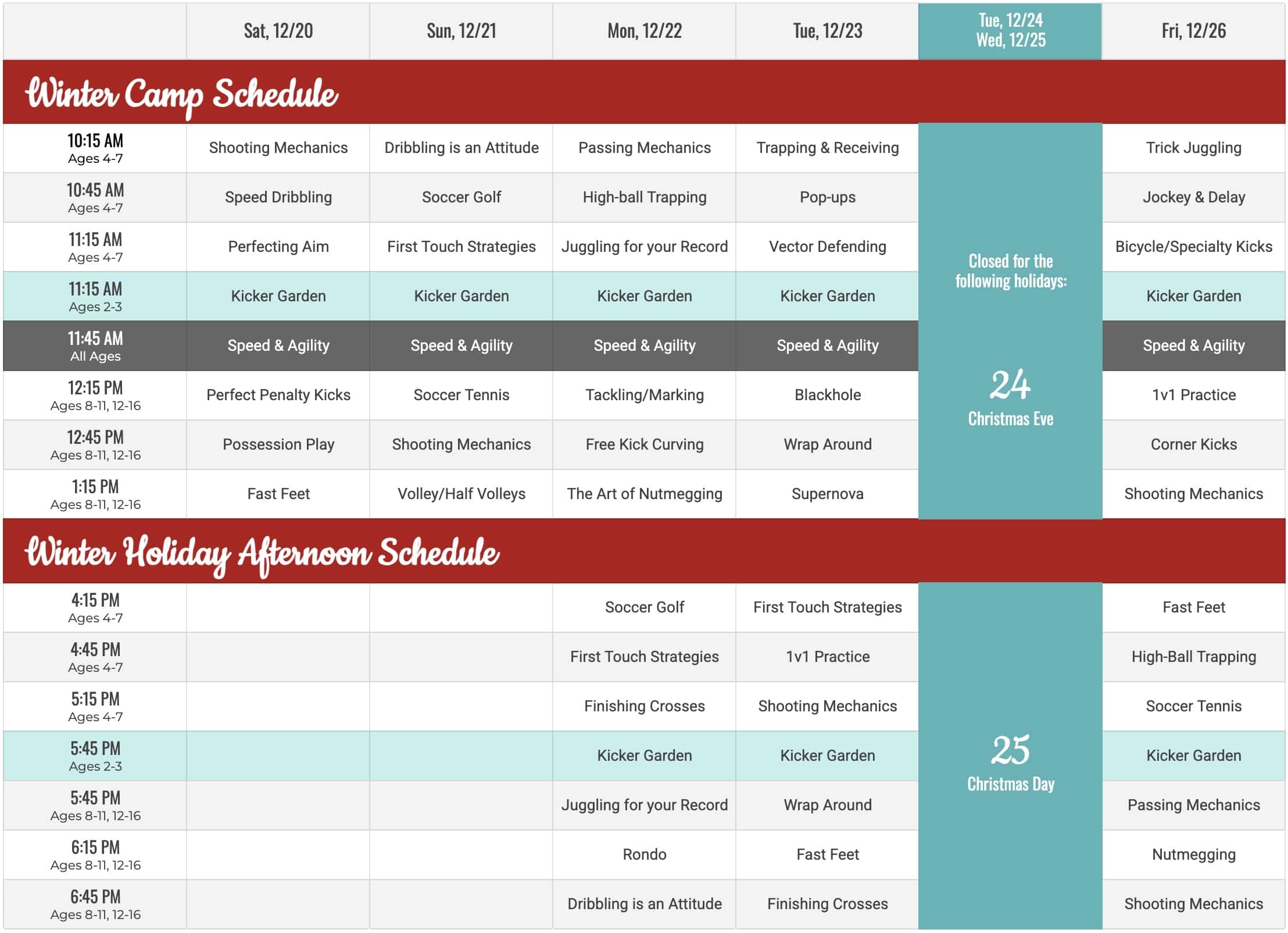 Winter Campers are welcome to use the Winter Holiday Afternoon Schedule if they are unable to make the regular camp schedule (10:15 AM to 1:45 PM) as long as they attend their appropriate age group. Players in Winter Immersion & Fall Max Plan may attend the afternoon sessions from 4:15 PM onwards.